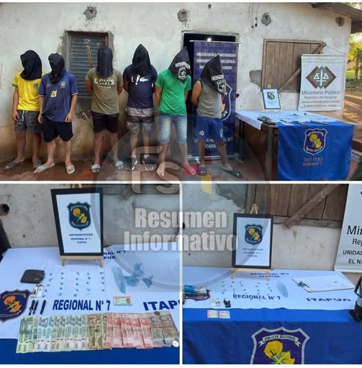 Obligado, Itapúa. Un procedimiento policial realizado en la tarde de este miércoles dejó como resultado la detención de seis personas y la incautación de presunta droga, dinero en efectivo, celulares...