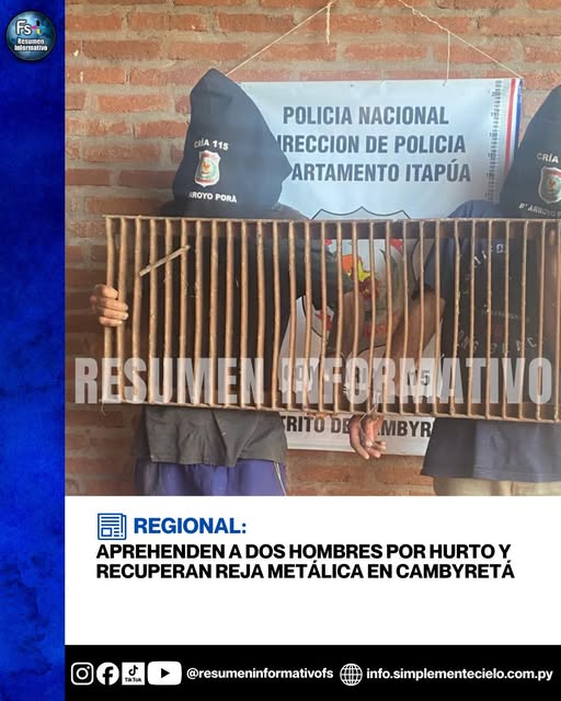 Dos hombres fueron aprehendidos en la tarde de este martes en el barrio Arroyo Porã, distrito de Cambyretá, en prosecución a un supuesto hecho de hurto. Durante el procedimiento, agentes...
