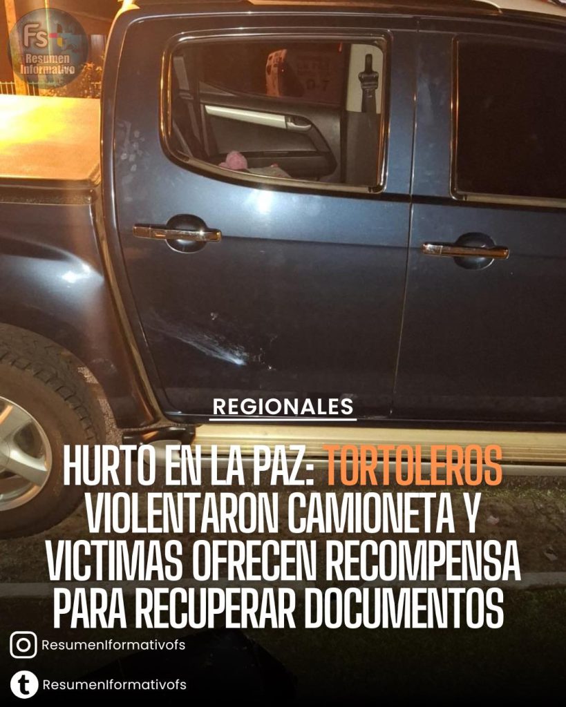 HURTO EN LA PAZ: TORTOLEROS VIOLENTARON CAMIONETA Y VICTIMAS OFRECEN RECOMPENSA PARA RECUPERAR DOCUMENTOS.