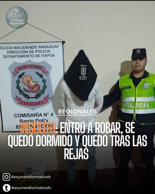 Un hecho insólito se registró en Encarnación, donde la Policía Nacional aprehendió a un hombre que quedó dormido dentro de la vivienda que pretendía robar. El detenido fue identificado como Sergio Javier Pintos, de 30 años, quien además tenía una orden de captura vigente por hurto.