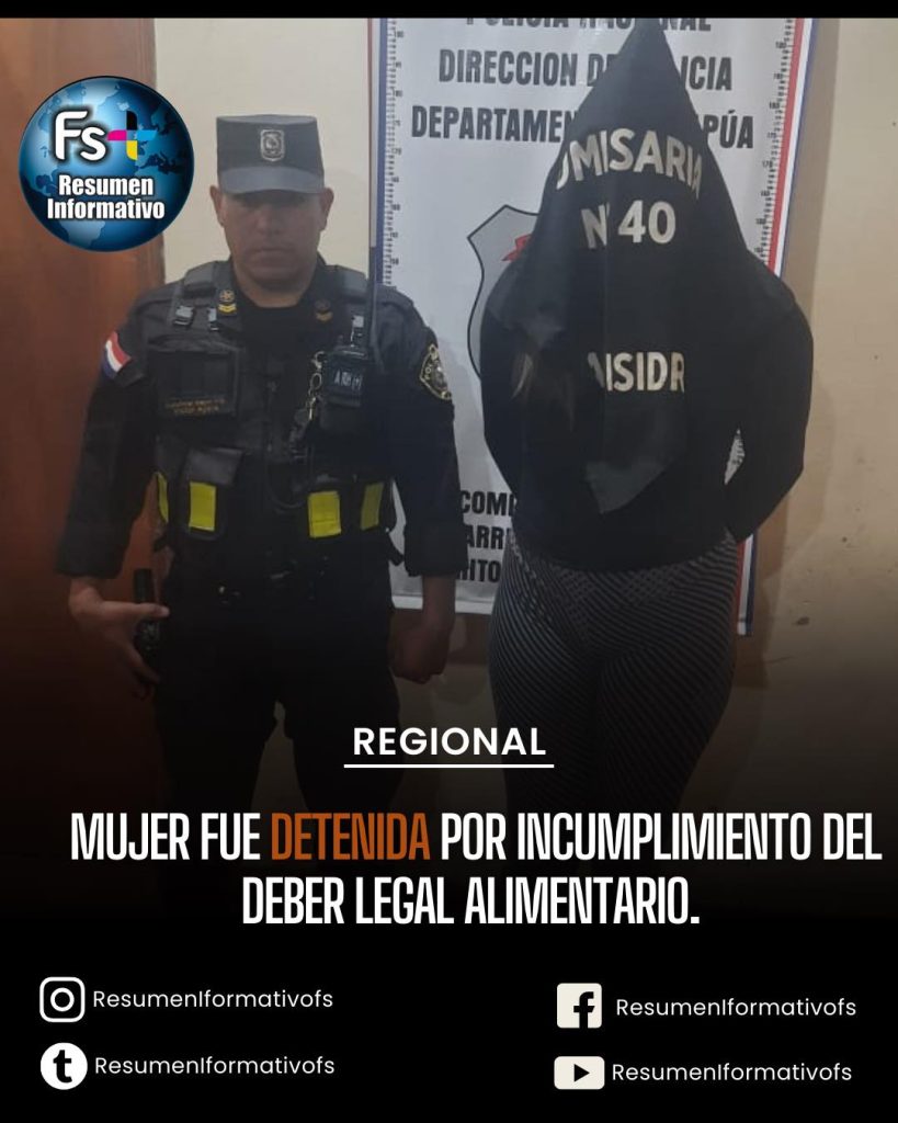 Una mujer fue detenida en la noche de hoy jueves en el barrio San Isidro de Encarnación, por contar con una orden de captura pendiente en una causa por supuesto incumplimiento del deber legal alimentario.
