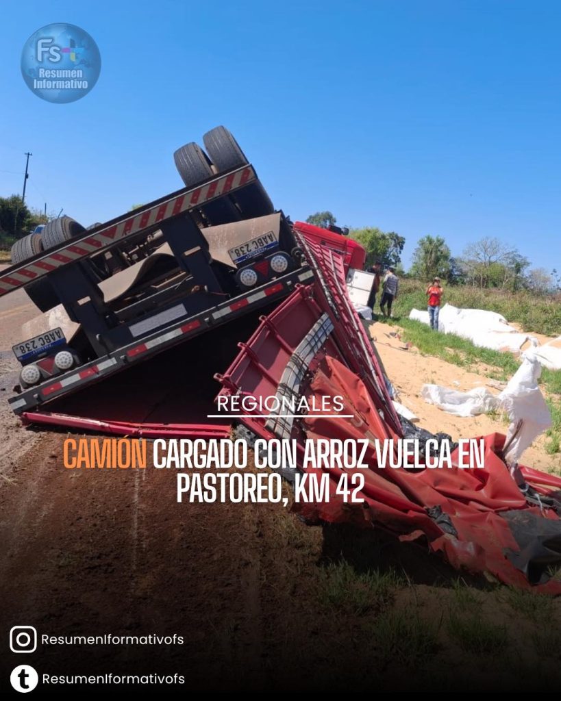 Un accidente de tránsito con daños materiales se registró este miércoles en la zona de Pastoreo, a la altura del kilómetro 42, cuando un tractocamión cargado con arroz volcó a un costado de la ruta.