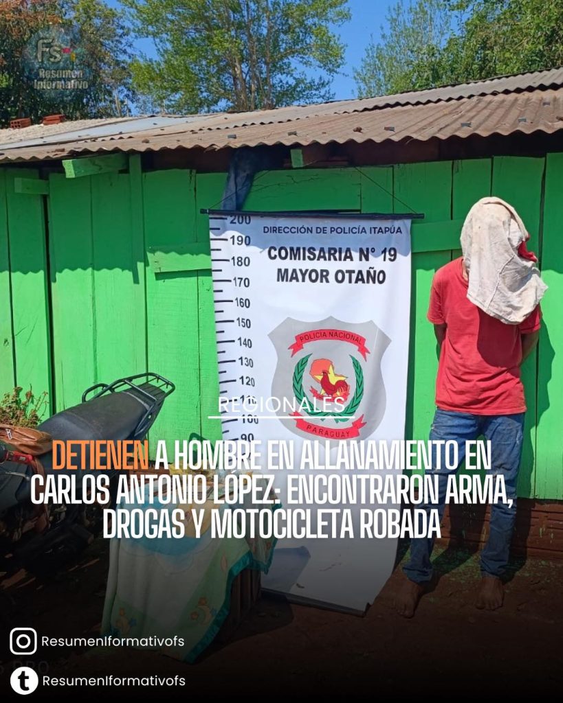 Un allanamiento fiscal y policial realizado en el barrio Santa Librada, distrito de Carlos Antonio López, terminó con la detención de un hombre de 29 años que contaba con órdenes de captura pendientes y en cuyo poder se hallaron un arma de fuego, drogas y una motocicleta denunciada como robada.