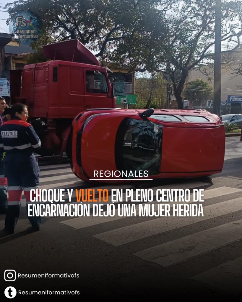 Un aparatoso accidente de tránsito se registró en la mañana de hoy sobre la avenida Bernardino Caballero, en su intersección con la calle Carlos Antonio López de Encarnación, dejando como saldo una mujer herida y un vehículo volcado.