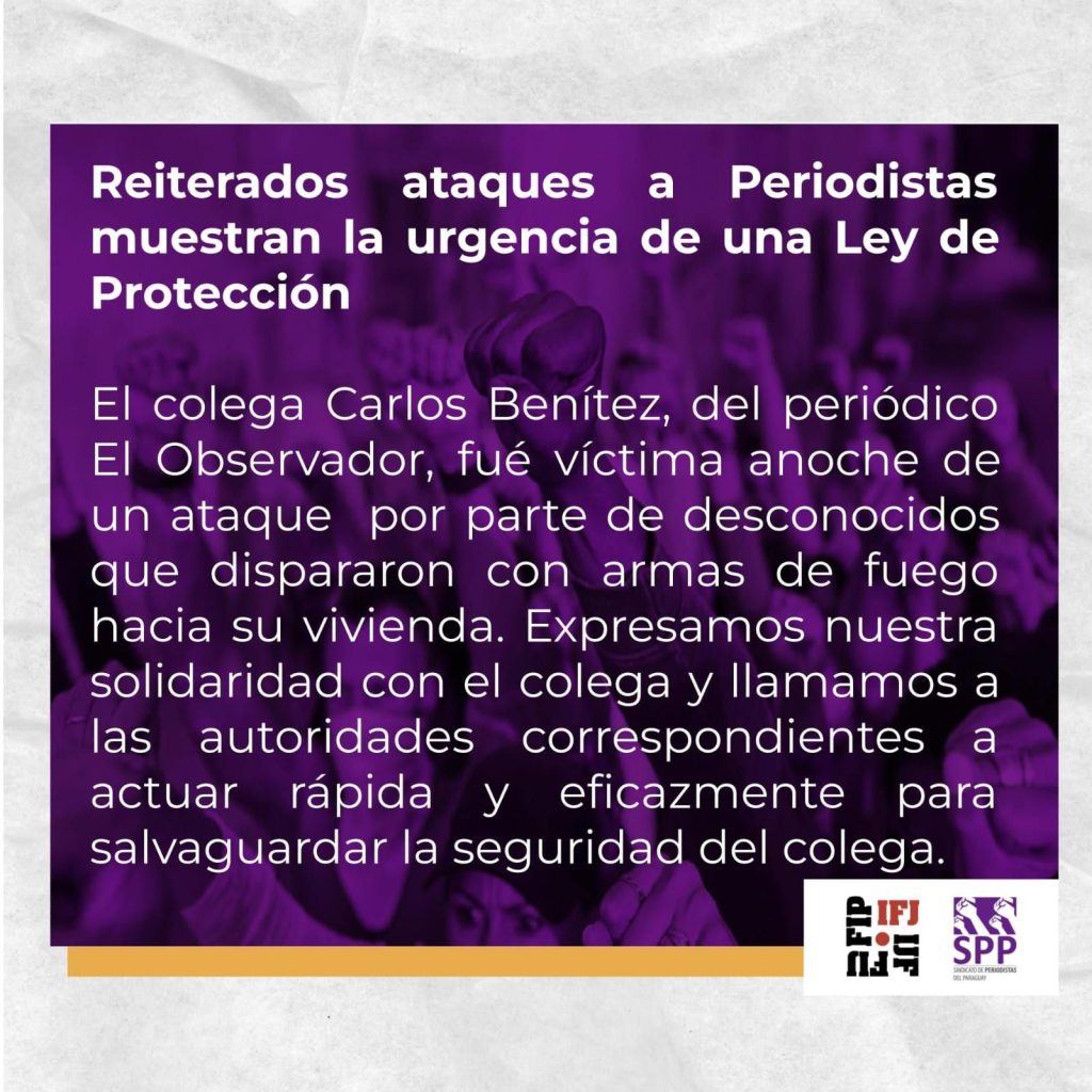 El periodista Carlos Benítez, del periódico El Observador, fue víctima anoche de un violento ataque perpetrado por desconocidos, quienes efectuaron disparos de arma de fuego contra su vivienda. Desde este espacio expresamos nuestra solidaridad con el colega y exhortamos a las autoridades a actuar con rapidez y eficacia para salvaguardar su seguridad.