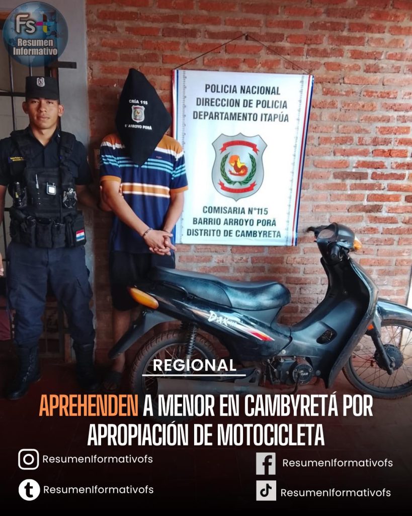 El procedimiento se llevó a cabo alrededor de las 16:00 de este miércoles, en la vía pública del barrio Arroyo Porã. El menor y la motocicleta fueron trasladados hasta la sede de la Comisaría 115°, desde donde se comunicó el caso al Ministerio Público para las diligencias de rigor.