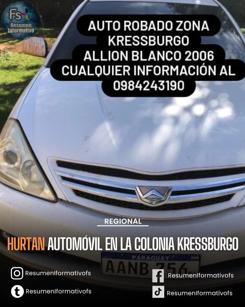 La denuncia fue presentada en la Comisaría 111° de Kressburgo por Pedro Nicolás Ozorio Da Silva, de 27 años, propietario del vehículo sustraído, un Toyota Allion, año 2005, color blanco, con chapa AANB 756-PY, registrado a nombre de Juana Barrios Agüero.