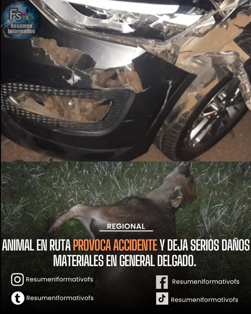 Un accidente de tránsito que involucró a un vehículo y un animal vacuno se registró en la madrugada de este lunes, sobre la Ruta PY01, a la altura del kilómetro 284, en la localidad de General Delgado, departamento de Itapúa.