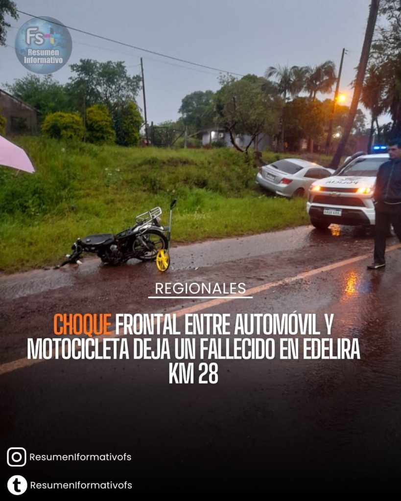 CHOQUE FRONTAL ENTRE AUTOMÓVIL Y MOTOCICLETA DEJA UN FALLECIDO EN EDELIRA KM 28.