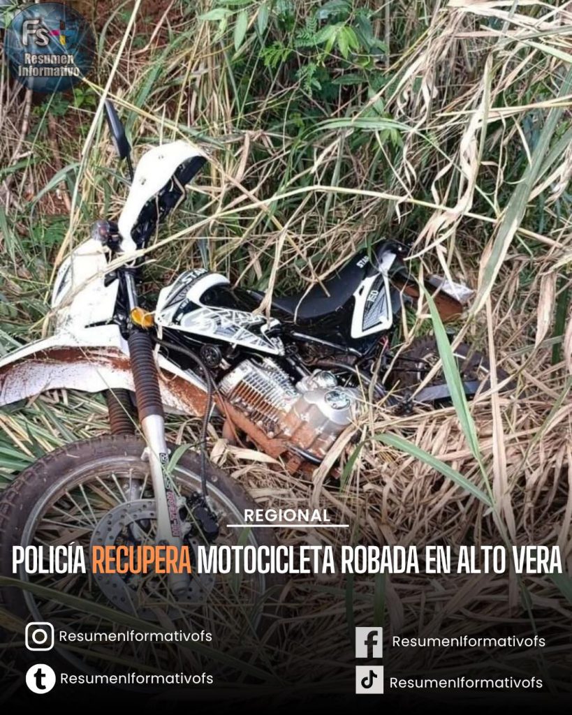 Efectivos de la Comisaría 35° de Caronay, en el distrito de Alto Vera, lograron recuperar una motocicleta que había sido denunciada como robada el día anterior. El hallazgo se produjo en un camino vecinal que conduce a la localidad de Pastoreo.