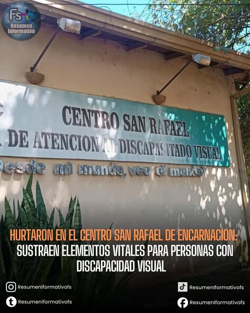 El Centro San Rafael de Encarnación, dedicado a la atención y rehabilitación de personas con discapacidad visual, fue víctima de un hurto durante el fin de semana. El hecho fue descubierto esta mañana cuando los encargados regresaron a las instalaciones y se encontraron con la puerta trasera violentada.