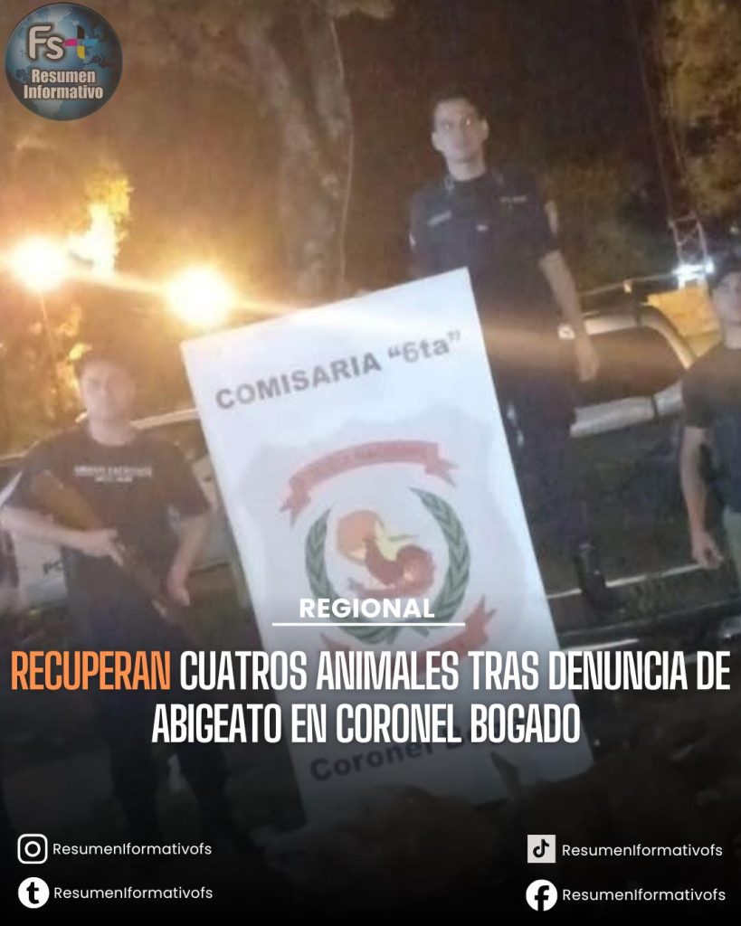 Una rápida y efectiva intervención policial permitió la recuperación de cuatro animales vacunos denunciados como desaparecidos en la compañía Cerrito, distrito de Coronel Bogado. El procedimiento se realizó en prosecución de una denuncia por supuesto hecho de abigeato, presentada por el propietario de los animales, Juan Carlos Bogado.