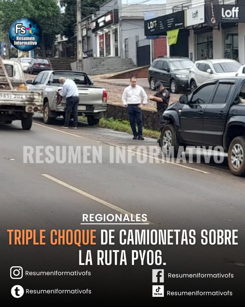 Un violento accidente de tránsito se registró en las primeras horas de este miércoles, poco después de las 7:00, sobre la Ruta PY06, a la altura del kilómetro 3. El hecho involucró a tres camionetas de gran porte que circulaban por el mismo carril: una Toyota Hilux, chapa CFU 370, conducida por Justin Javier Dickel; una Volkswagen Amarok, chapa AAHT 853, al mando de Oscar Godoy Silvero; y una Kia, guiada por Javier Alcides Álvarez Cabrera.