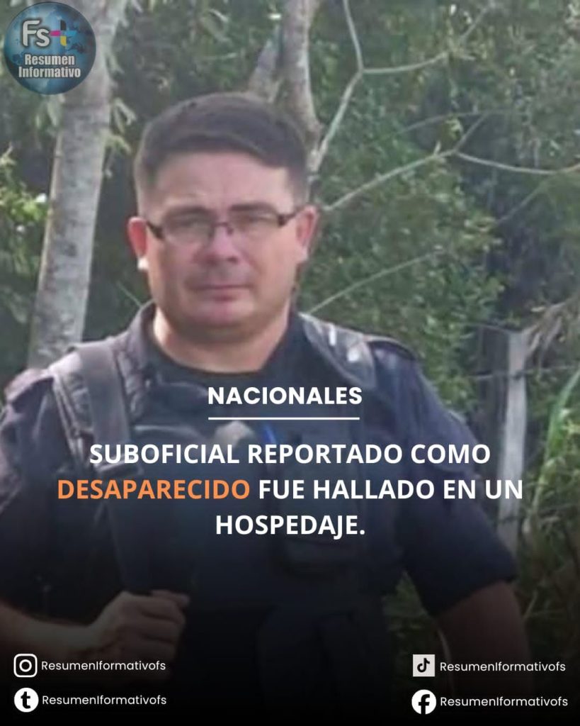 El suboficial Roberto García Villalba, quien había sido denunciado como desaparecido, fue encontrado por agentes del Departamento de Investigaciones en un hospedaje ubicado en la compañía Caundy, distrito de Félix Pérez Cardozo.