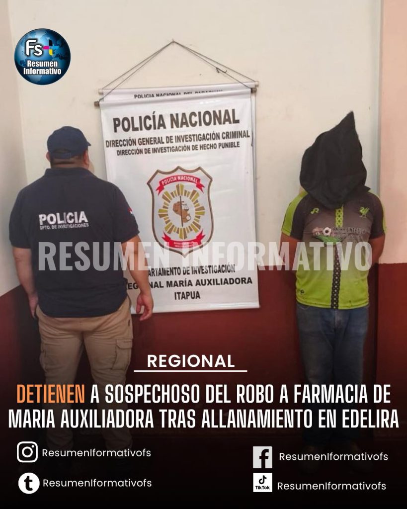 Un allanamiento realizado este miércoles en el distrito de Edelira permitió la detención de un hombre y la incautación de varios objetos vinculados a un presunto hecho de robo agravado registrado días atrás en una farmacia de María Auxiliadora. El procedimiento fue ejecutado por agentes del Departamento de Investigaciones Regional María Auxiliadora, en coordinación con la Comisaría 16 y el Ministerio Público.