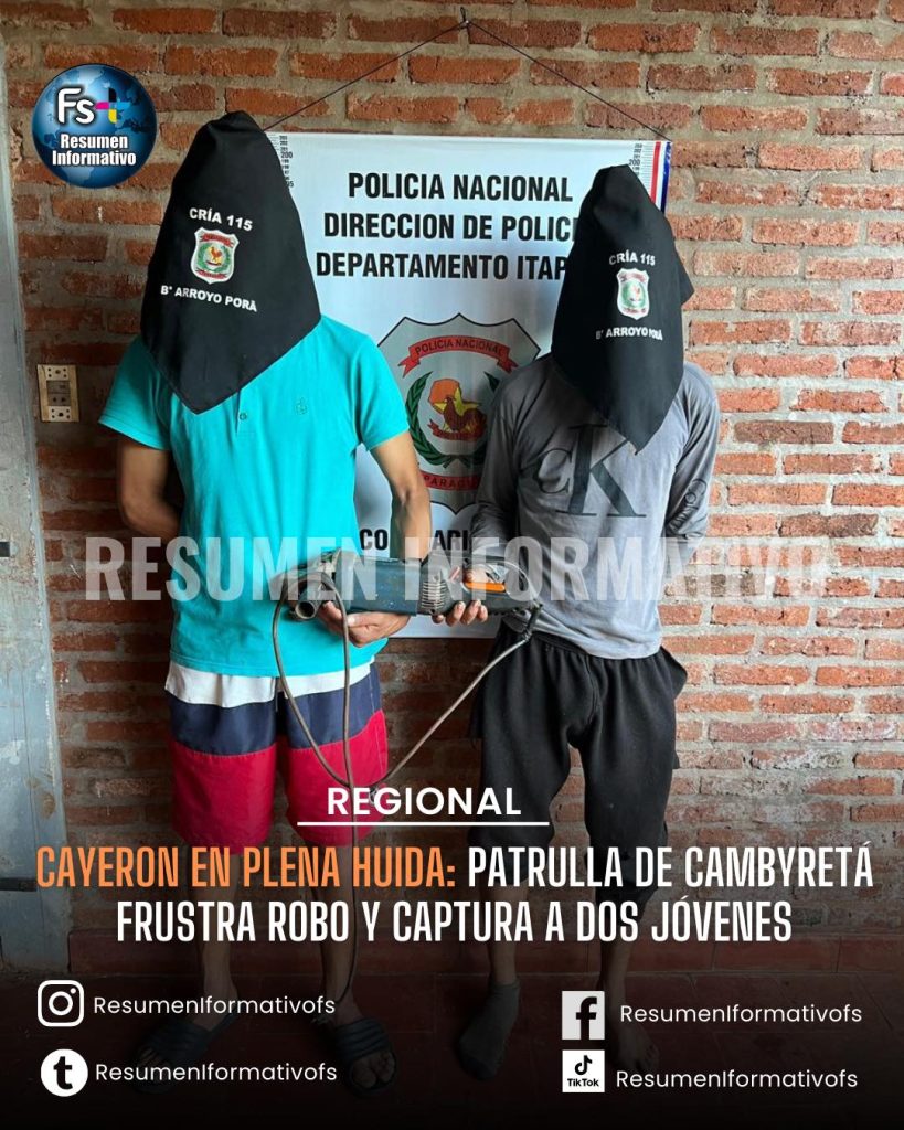 En una rápida intervención policial registrada en la tarde de este jueves, agentes de la Comisaría 115° del barrio Arroyo Porã lograron la aprehensión de dos jóvenes implicados en un supuesto hecho de hurto y recuperaron el objeto denunciado.
