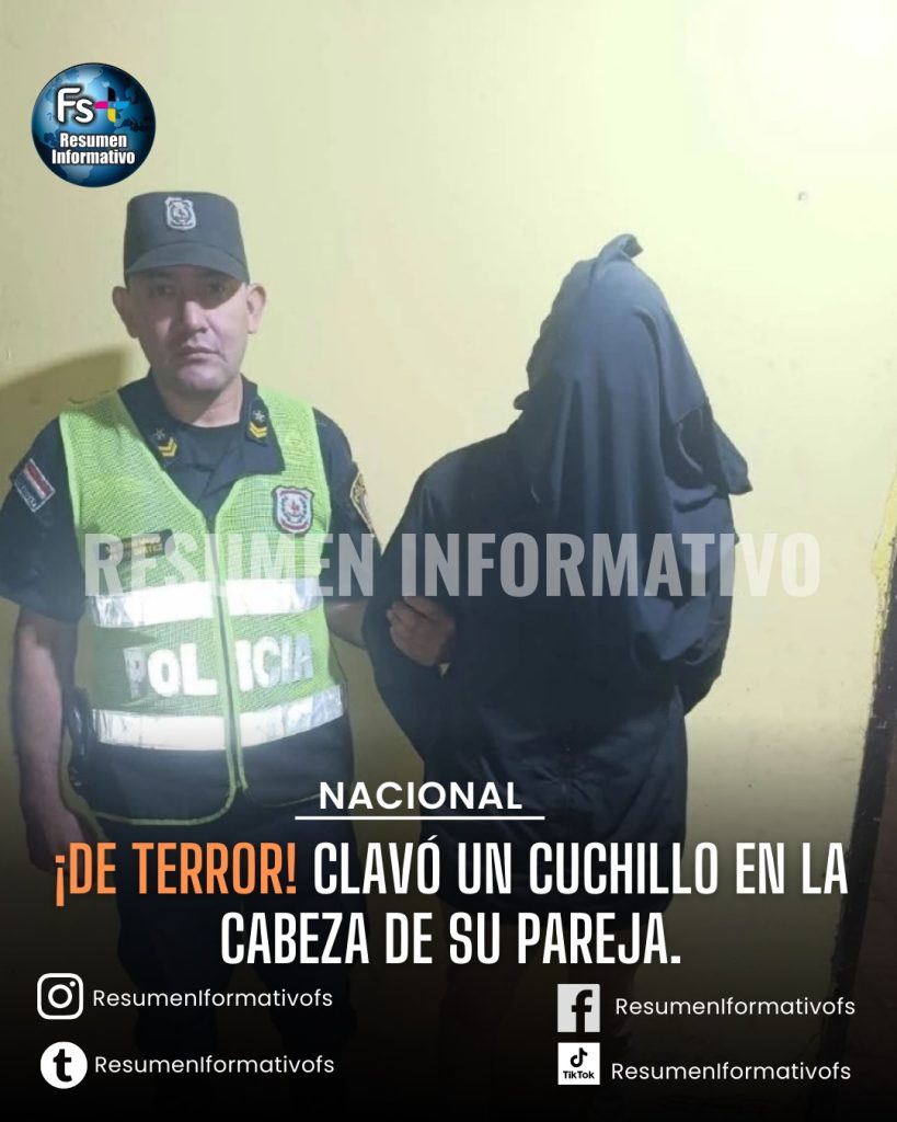 Noelia (27) quedó con una herida sangrante en la cabeza, luego de que su pareja, Carlos Bogado (32), le clavó con un cuchillo tipo estoque. El terrible caso ocurrió ayer, domingo, en la Compañía Caraguata, de San Juan Nepomuceno, departamento de Caazapá.