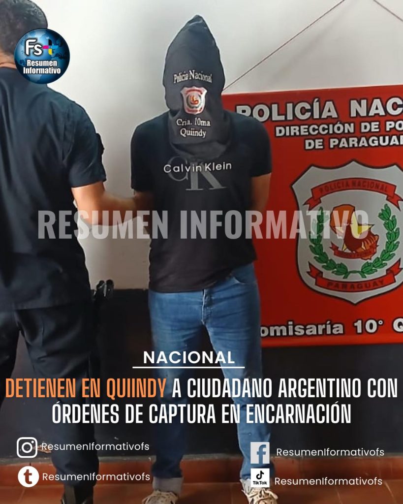 La Comisaría 10° de Quiindy informó la aprehensión de un hombre de nacionalidad argentina por su presunta vinculación a un hecho de hurto domiciliario y el cumplimiento de varias órdenes judiciales y fiscales pendientes. El procedimiento se realizó este 7 de diciembre a las 14:00 horas en el kilómetro 113 de la Ruta PY01, circunvalación de Quiindy, en inmediaciones del depósito denominado San Agustín.