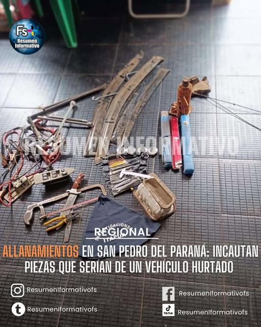 Agentes del Departamento de Investigaciones, en conjunto con el Ministerio Público, realizaron allanamientos en dos viviendas de la ciudad de San Pedro del Paraná, tras el hurto de un automóvil que se registró el pasado sábado en horas de la madrugada, en la Localidad de José Leandro Oviedo.