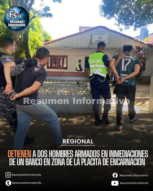 Dos personas fueron detenidas hace instantes en las inmediaciones de un banco, ubicado en la zona del mercado municipal La Placita, en Encarnación, luego de ser sorprendidas por personal policial mientras circulaban en una motocicleta.