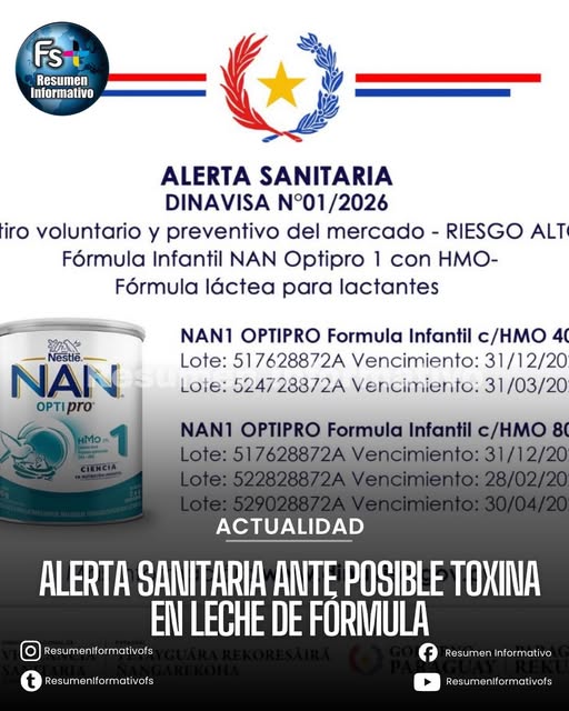 La Dinavisa informó a la población que la empresa Nestlé Paraguay S.A. inició el retiro voluntario y preventivo del mercado de determinados lotes de productos destinados a lactantes. Se trata de la Fórmula Infantil NAN Optipro 1 con HMO- Fórmula láctea para lactantes.