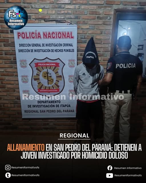 Un procedimiento encabezado por el Departamento de Investigaciones de Itapúa permitió en la madrugada de este sábado la detención de un joven de 20 años, en el marco de una investigación por un hecho punible contra la vida (homicidio doloso).