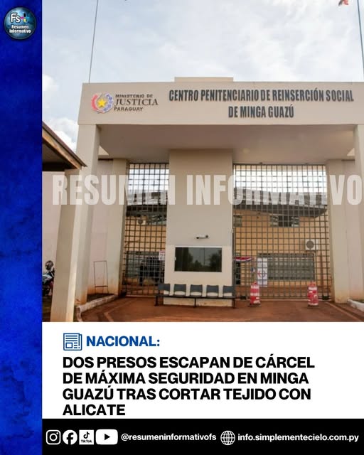 El Ministerio de Justicia informó la fuga de dos internos de alta peligrosidad de la cárcel de máxima seguridad de Minga Guazú, Departamento de Alto Paraná. Utilizaron alicate y sierritas para abrir sus celdas y el tejido. Supuestamente falló el centro de monitoreo.