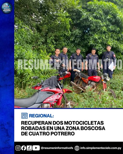 Agentes de la Comisaría 38ª del barrio Cuatro Potrero, en conjunto con personal de la Comisaría 11ª de Capitán Miranda, lograron recuperar dos motocicletas denunciadas como robadas, durante un procedimiento realizado en la tarde de este sábado en una zona boscosa de la ciudad de Encarnación.