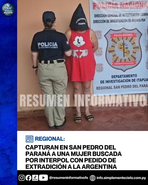 Un importante operativo del Departamento de Investigaciones de Itapúa permitió este miércoles la detención de una mujer con Notificación Roja de Interpol, requerida por la Justicia de la República Argentina por graves hechos de robo y hurto cometidos en banda, delitos por los que enfrenta una pena de hasta 18 años de prisión.