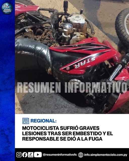 Un accidente de tránsito se registró en las últimas horas sobre la Ruta PY06, a la altura de Nisur, donde un motociclista sufrió graves heridas tras ser embestido por un vehículo cuyo conductor huyó del lugar, dejando a la víctima en estado crítico.