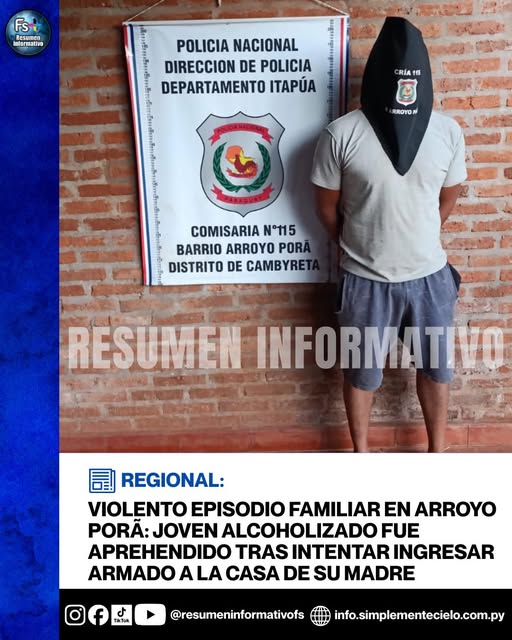 VIOLENTO EPISODIO FAMILIAR EN ARROYO PORÃ: JOVEN ALCOHOLIZADO FUE APREHENDIDO TRAS INTENTAR INGRESAR ARMADO A LA CASA DE SU MADRE