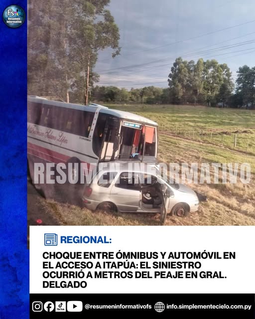 CHOQUE ENTRE ÓMNIBUS Y AUTOMÓVIL EN EL ACCESO A ITAPÚA: EL SINIESTRO OCURRIÓ A METROS DEL PEAJE EN GRAL. DELGADO