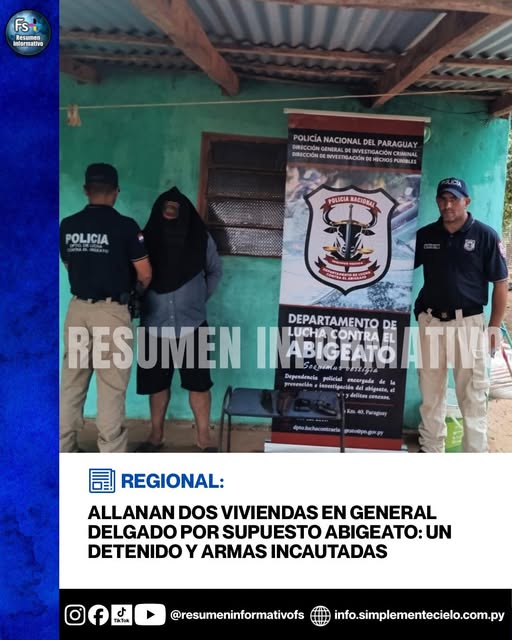 Un operativo simultáneo encabezado por agentes de la Comisaría 46° San Dionisio, con apoyo del Departamento de Anti Abigeato y bajo dirección del agente fiscal Rodolfo Colmán, dejó como resultado la aprehensión de un hombre y la incautación de un arma de fuego y un arma blanca, en el distrito de General Delgado, departamento de Itapúa.