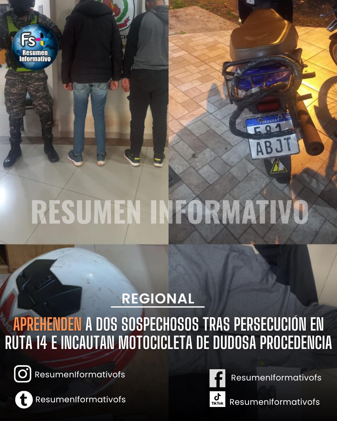 APREHENDEN A DOS SOSPECHOSOS TRAS PERSECUCIÓN EN RUTA 14 E INCAUTAN MOTOCICLETA DE DUDOSA PROCEDENCIA