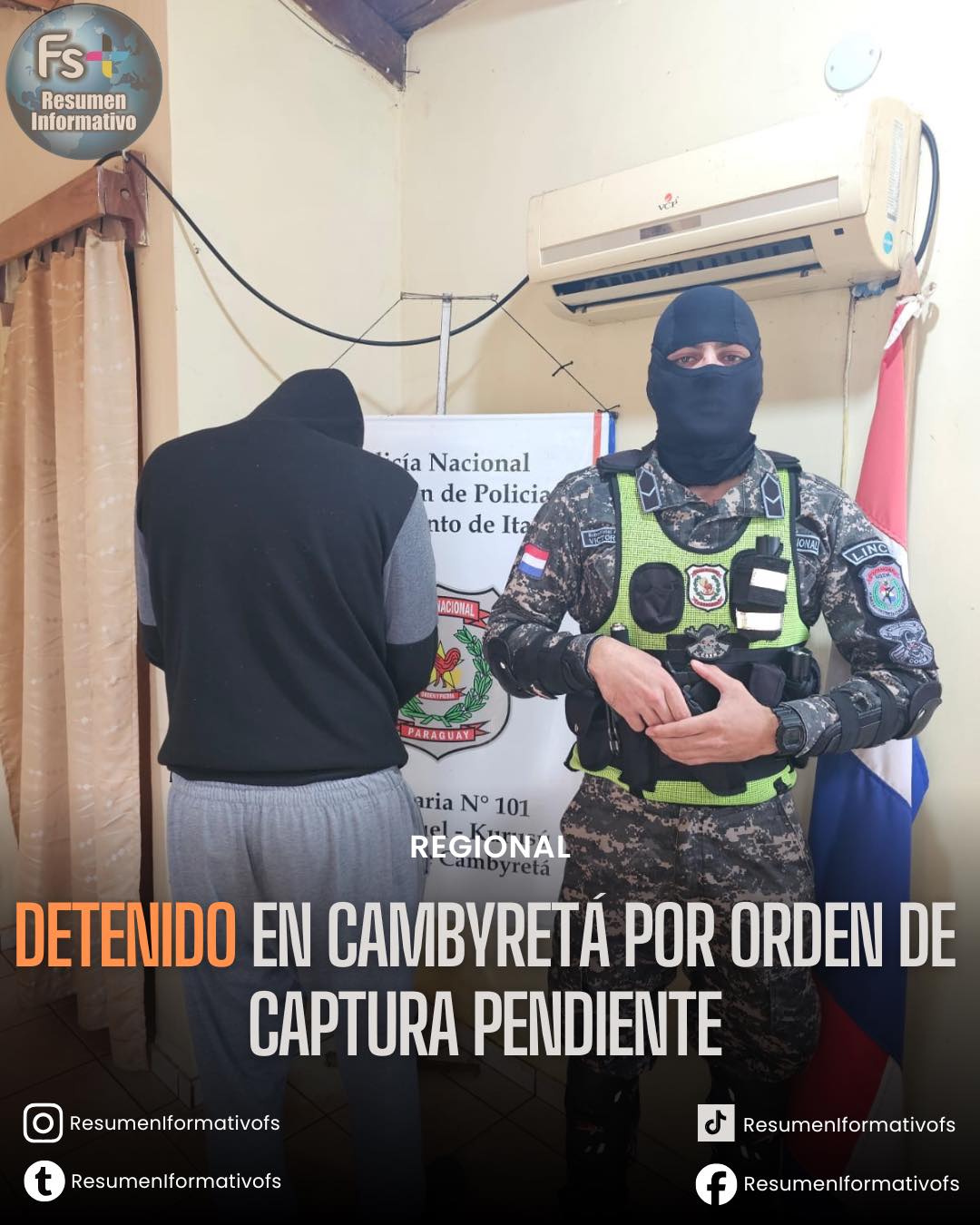 Agentes del Grupo Lince detuvieron este sábado a un hombre con orden de captura vigente durante un patrullaje preventivo en la zona de acceso al barrio Mburika, distrito de Cambyretá....