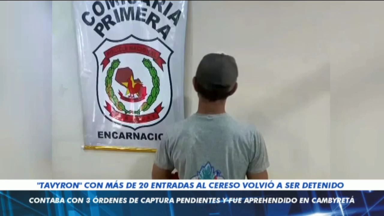 «TAVYRON» CON MÁS DE 20 ENTRADAS AL CERESO VOLVIÓ A SER DETENIDO Un hombre con frondosos antecedentes fue detenido sobre la vía pública, camino vecinal del Asentamiento Mburika, de Cambyretá....