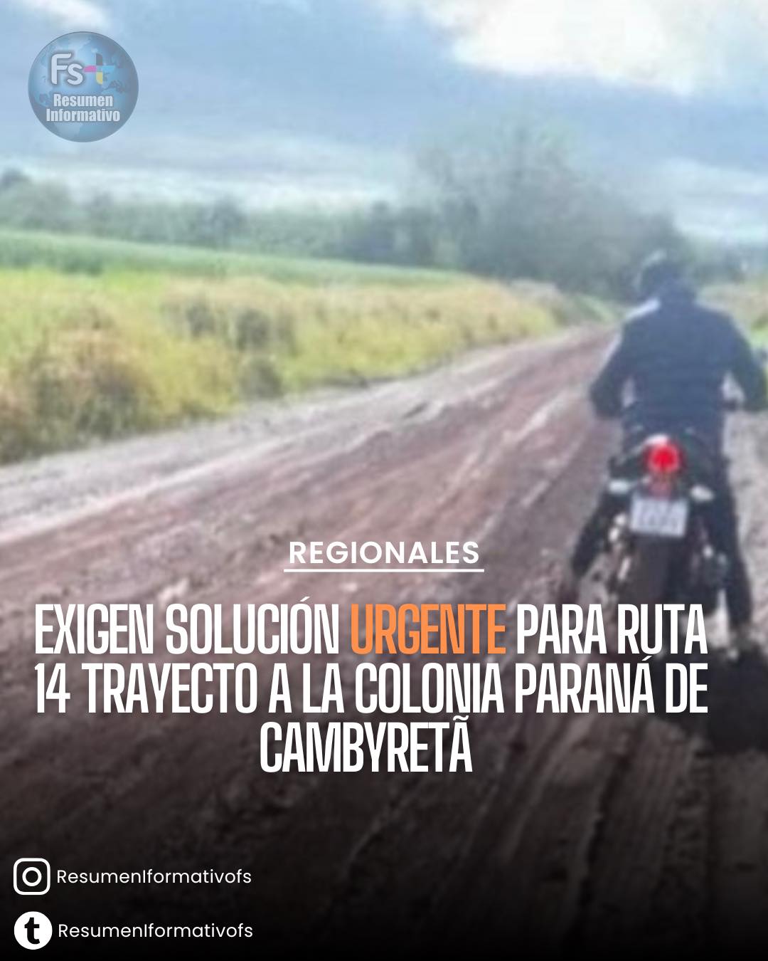 Vecinos y trabajadores de la zona de Colonia Paraná, en el distrito de Cambyretã, alzaron su voz de reclamo ante el deplorable estado de la Ruta 14, vía que utilizan...