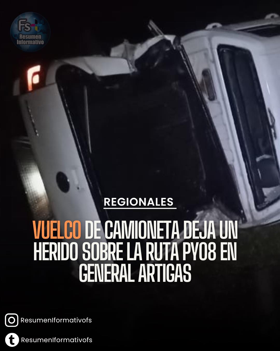 VUELCO DE CAMIONETA DEJA UN HERIDO SOBRE LA RUTA PY08 EN GENERAL ARTIGAS Un accidente de tránsito con vuelco de vehículo se registró en la madrugada de este jueves 4...